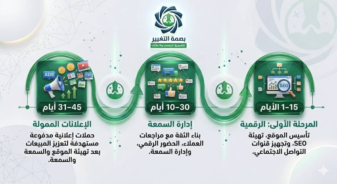 خلال 45 يوم فقط، لا نقوم فقط بإطلاق حملات إعلانية… بل نبني لك نظام تسويقي متكامل يبدأ من التأسيس الصحيح، مرورًا ببناء الثقة، وانتهاءً بتحقيق المبيعات. هذه هي منهجية بصمة التغيير التي تصنع الفرق الحقيقي بين إعلان يُصرف عليه… وتسويق يحقق أرباحًا مستدامة.